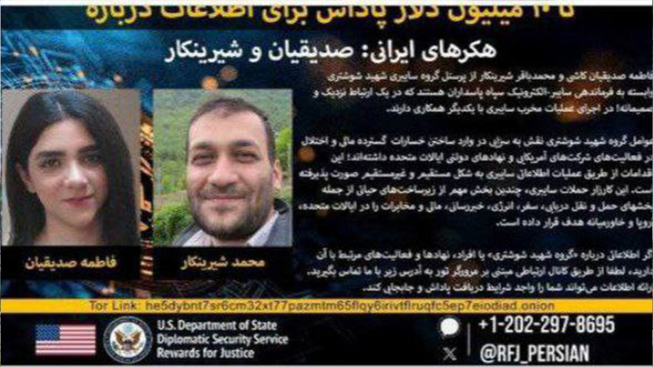 وزارت خارجە آمریکا اعلام کردە، دو شخص با نامهای "فاطمە صدیقیان کاشی و محمدباقر شیرین کار"، دو هکر ایرانی وابستە بە سپاە پاسداران هستند و هر کس بتواند اطلاعات در مورد آنان بە آمریکا ارائە کند، جایزە ۱۰ میلیون دلاری بە او دادە میشود.