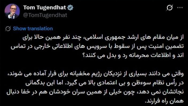تام توگندات، وزیر پیشین امنیت بریتانیا و رئیس سابق کمیته امور خارجی پارلمان، با انتشار پیامی کمسابقه به زبان فارسی در شبکه اجتماعی ایکس، از تشدید بحران اعتماد در بالاترین سطوح قدرت رژیم ایران پرده برداشت .