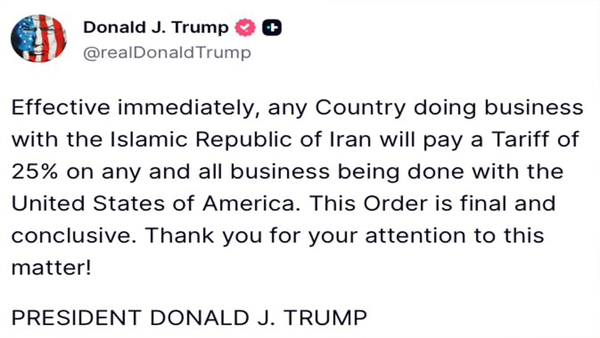 Donald Trump ê Serkomarê Amerîkayê roja Sêşemî 13ê Kanûna Paşîn peyamek belav kir û hoşdariyekî tund da welatên cîhanê ku ji 13ê Kanûna Paşîn a 2026 ve, heçî welatek digel rêjîma îslamiya Îranê pêwendiya ticarî hebe, dê bikeve ber sizaya Amerîka û ev kompaniya û şirketên ticariye ku pêywendiya ticarî digel Amerîka yê jî henî, ger ticaretê digel rêjîma Îranê bikin, dê bikevne ber baca %25 a Amerîkayê û li her danûstandin û ticaretekê de digel Amerîka dê vê baca %25 bide Amerîkayê.