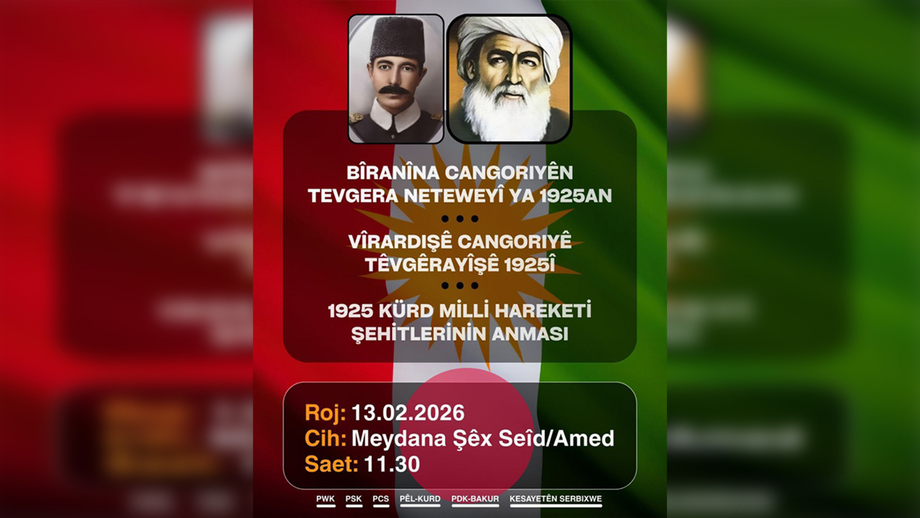 Platforma Ciwanên Serbixwe (PCS), Partîya Demokrat a Kurdistanê-Bakur (PDK-Bakur), PÊLKURD, Partîya Sosyalîst a Kurdistanê (PSK), Partîya Welatparêzên Kurdistanê (PSK) û kesayetên serbixwe, bi minasebeta 101emîn salvegera Tevgera Milî ya 1925ê ya ku bi rêbertîya Şêx Seîd pêk hatibû de, roja înîyê, 13.02.2026ê, di saet 11.30ê de, dê li Amedê, li Qada Şêx Seîd daxuyanîyeke çapemenîyê bidin.
