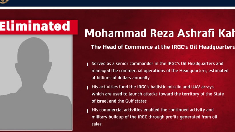 Pêka rapora “Jerusalem Post”, Artêşa Îsraîlê roja Yekşemî 5ê Nîsanê, ragihand ku hêza esmaniya Îsraîl di operasyonekê de li roja Înê, Mihemedriza Eşrefî Kahî, yek ji fermandeyên biryargeha nefta sipaha pasdaran a terorîst, kuştine.