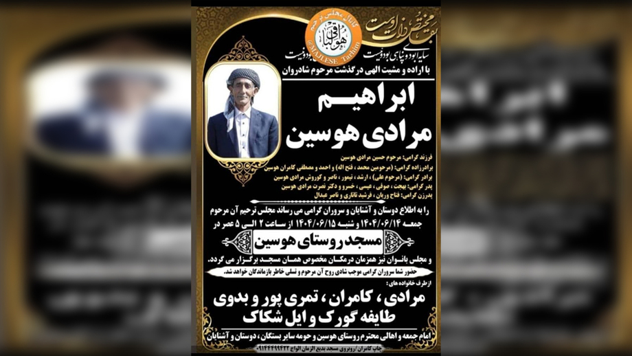 ڕۆژی پێنجشەممە ١٤٣ی خەرمانانی ١٤٠٤، مام ئیبراهیم مورادی هۆوەرسین، خەڵکی دەڤەری سۆما بەهۆی نەخۆشیی دڵەوە لە تەمەنی ٨٤ ساڵیدا کۆچی دوایی کرد.