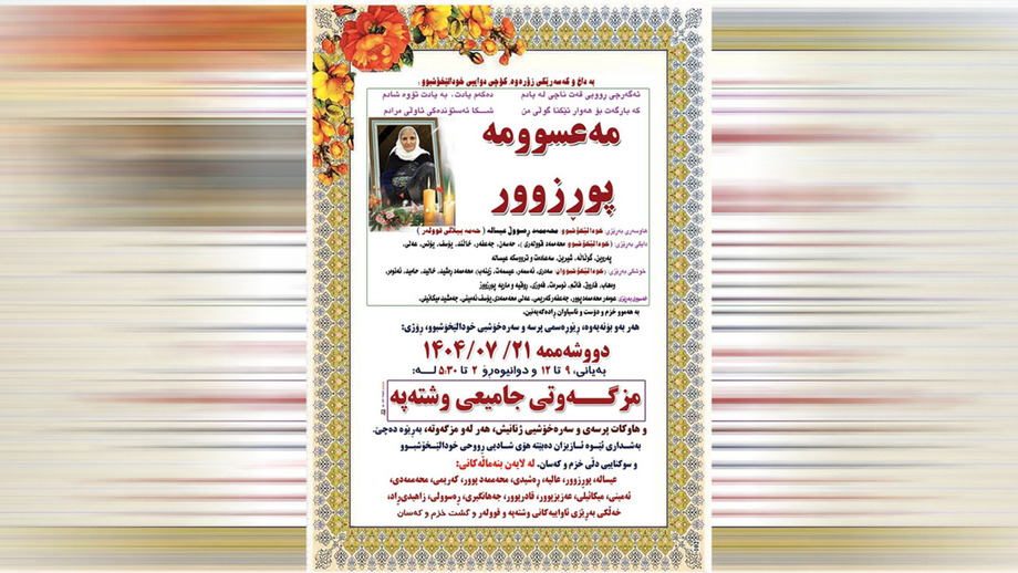 ڕۆژی یەکشەممە ٢٠ی ڕەزبەری ١٤٠٤، دایە مەعسوومە پورزوور، دایکی شەهیدێکی کوردستان کۆچی دوایی کرد.