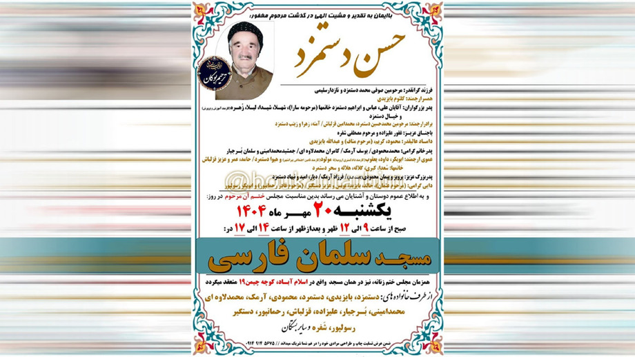 ڕۆژی شەممە ١٩ی ڕەزبەری ١٤٠٤، کاک حەسەن دەستمۆزد کەسایەتیی خۆشناوی ناوچەی بۆکان و خەڵکی ئاوایی سەراو بە هۆی نەخۆشییەوە کۆچی دوایی کرد.