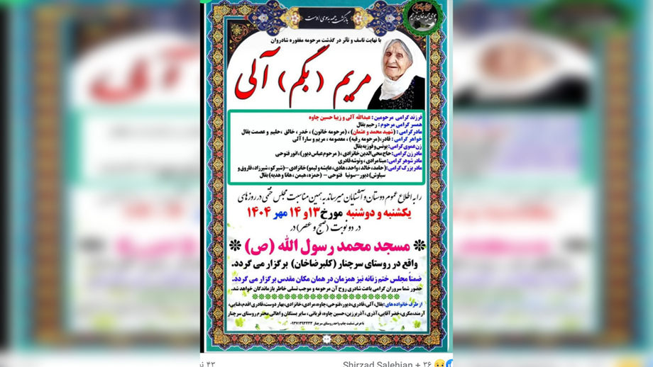 ڕۆژی یەکشەممە ١٣ی ڕەزبەری ١٤٠٤، دایە مریەم ئالی دایکی دوو شەهیدی کوردستان، محەممەد بەقال و شەهید عوسمان بەقال بە هۆی پیری و بەساڵاچووییەوە لە شارەدێی سەرچنار ماڵاوایی لە ژیان کرد.