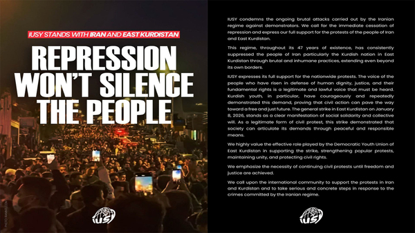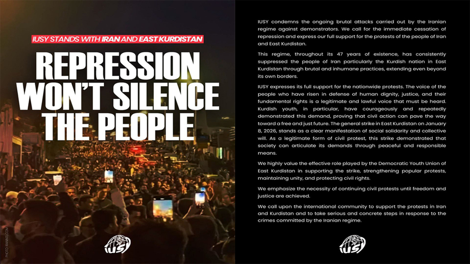 یەکیەتیی نێونەتەوەیی لاوانی سوسیالیست، پاڵپشتیی تەواوی خۆی لە ناڕەزایەتییە سەرانسەرییەکان ڕادەگەیەنێت. دەنگی خەڵکێک کە بۆ بەرگری لە کەرامەتی مرۆیی، دادپەروەری و مافی بنەڕەتیی خۆی ڕاپەڕیوە، دەنگێکی ڕەوا و یاسایییە کە دەبێ ببیسترێت.