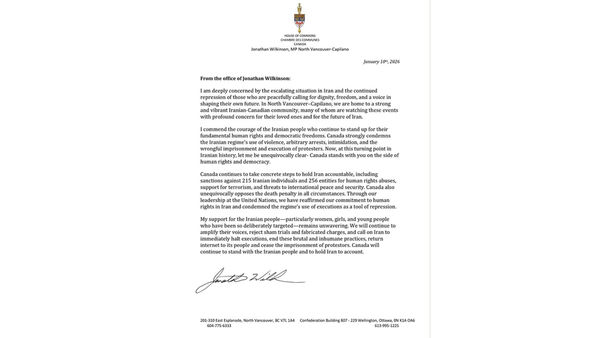ئۆتاوا – جۆناتان ویلکینسۆن، ئەندامی پەرلەمانی کانادا، لە بەیاننامەیەکی فەرمیدا وێڕای بەرز نرخاندنی ئازایەتیی خەڵکی ئێران، جەختی لە پابەندیی نەگۆڕی وڵاتەکەی بۆ پشتیوانیکردن لە خۆپێشاندەران و لێپرسینەوە لە ڕێژیمی ئێران کردەوە.