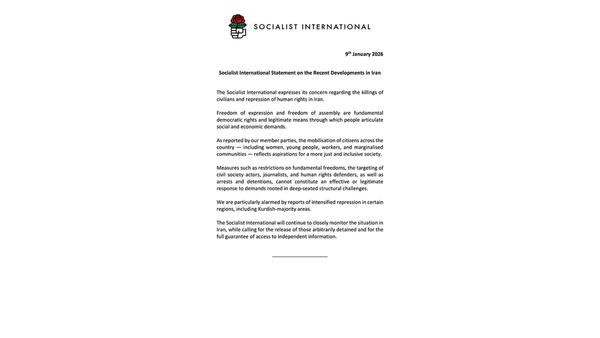 ڕێکخراوی ئینتێرناسیۆنال سۆسیالیست نیگەرانیی خۆی بەرامبەر بە کوشتنی کەسانی مەدەنی و سەرکوتکردنی مافەکانی مرۆڤ لە ئێران دەردەبڕێت.