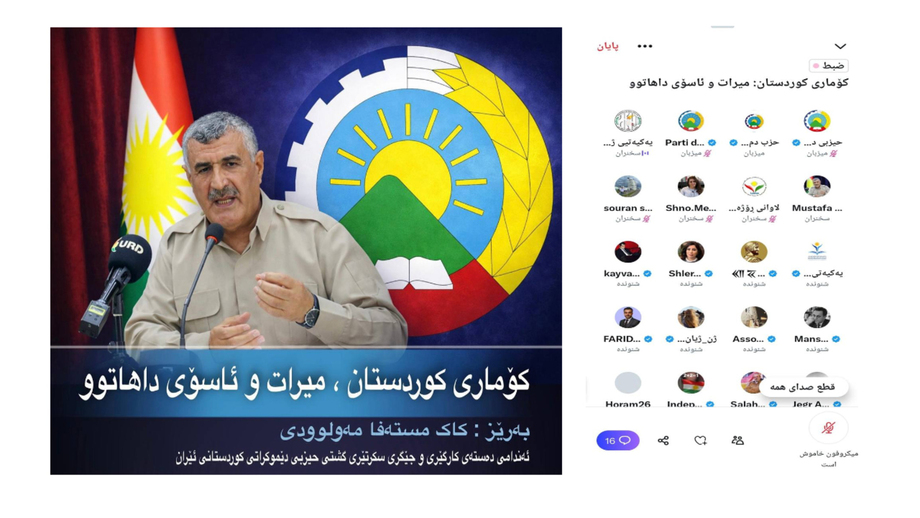 ڕۆژی پێنجشەممە ٢ی ڕێبەندانئ ١٤٠٤(٢٣/١/٢٠٢٦)، لەلایەن بەشی سۆشیاڵ میدیای دەرەوەی وڵاتی حیزبی دێموکراتەوە، سپەیسێک لە تۆڕی ئێکس بە ئامادەبوونی بەڕێز کاک مستەفا مەولوودی، جێگری سکرتێری گشتیی حیزبی دێموکراتی کوردستانی ئێران بەڕێوەچوو.