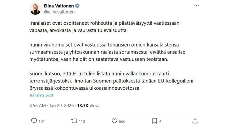 ئیلێنا ڤاڵتۆنێن، (Elina Valtonen) وەزیری دەرەوەی فینلاند، لە تۆڕی کۆمەڵایەتیی (X) نووسیوویەتی خەڵکی ئێران خوازیاری داهاتوویەکی ئازاد و شەرافەتمەندانەن و بوێرانە ئیرادەی خۆیان نیشان داوە.