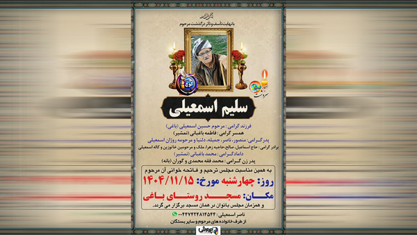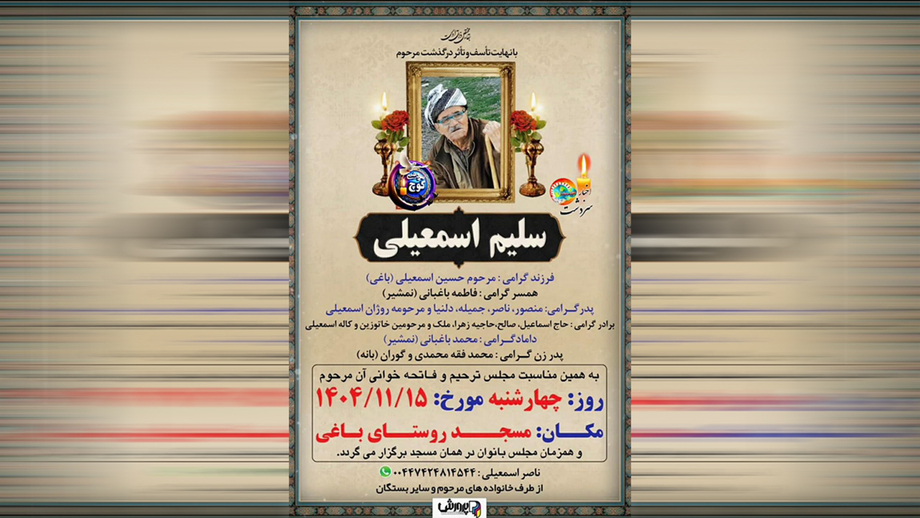 ڕۆژی سێشەممە ١٤ی ڕێبەندانی ١٤٠٤، کاک سەلیم ئیسماعیلی خەڵكی گوندی باغی بە هۆی چوونە سەری تەمەن و نەخۆشی ماڵاوایی لە ژیان کرد.