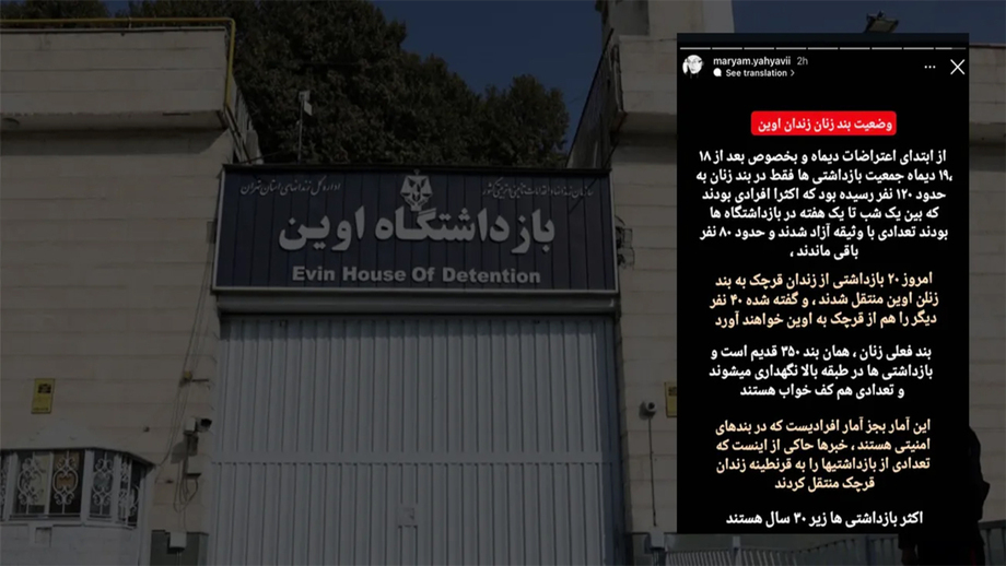 مریەم سادات یەحیەوی، بەندکراوی سیاسیی پێشوو، لە پۆستێکی ئینستاگرامدا، ئاماژەی بە ژمارەی بەندکراوانی بەندیخانەی ئێڤین کردووە و ڕایگەیاندووە، لە ڕێکەوتی ١٨ و ١٩ی بەفرانباردا نزیک بە ١٢٠ کەس دەسبەسەر کراون کە بەشێکی زۆریان تەمەنیان لەژێر ٣٠ ساڵاندایە.