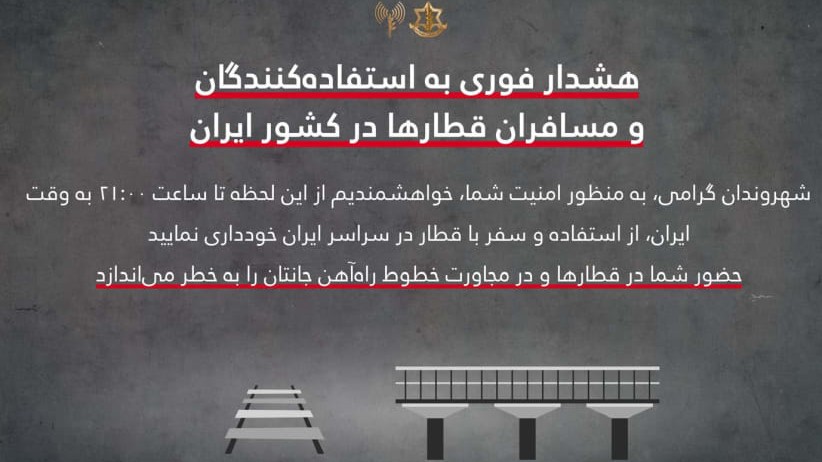 ئەرتەشی ئیسرائیل لە پەیامێکیدا بە زمانی فارسی، هۆشدارییەکی بەپەلە داوەتە خەڵکی ئێران کە بۆ پاراستنی گیانی خۆیان، لە هێڵەکانی گواستنەوەی شەمەندەفەر دوور بکەونەوە.