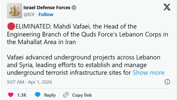 ئەتەشی ئیسرائیل ڕایگەیاند کە "مەهدی وەفایی"، بەرپرسی لقی ئەندازیاریی سپای قودس لە لوبنان، لە شاری مەحەلات کوژراوە. ناوبراو بە داڕێژەری سەرەکیی تونیێلە ژێرزەوییەکانی حیزبوڵڵا و کۆگاکانی چەک لە لوبنان و سووریە دادەنرێت.