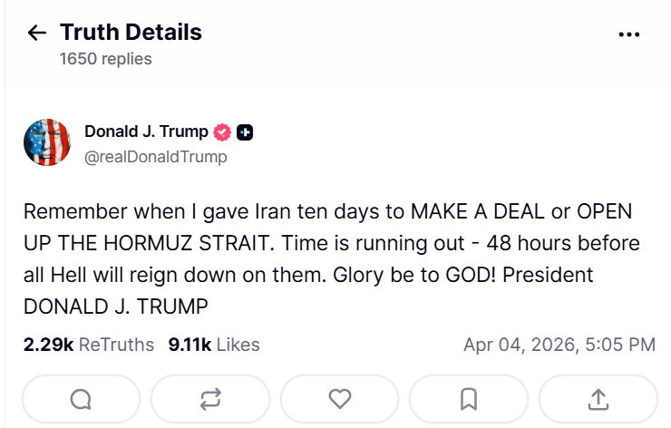 ڕۆژی شەممە ١٥ی خاکەلێوە، دۆناڵد ترامپ لە پەیامێکی کورتدا لە تۆڕی کۆمەڵایەتیی "ترووس سۆشاڵ" (Truth Social)، هۆشدارییەکی توندی ئاراستەی ڕێژیمی ئێران کرد و نووسی: "بیرتانە کە مۆڵەتی دە ڕۆژم بە ئێران دا بۆ ئەوەی ڕێککەوتن بکات یان گەرووی هۆرمۆز بکاتەوە؟ کات بەرەو تەواوبوون دەچێت؛ تەنیا ٤٨ کاتژمێری دیکە ماوە تا دۆزەخی تەواو بەسەریاندا ببارێت."